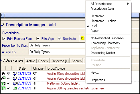 The following options are available from the right click menu within Prescription Manager:
