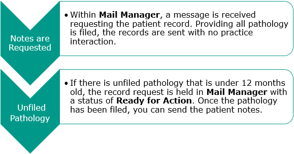 - An Incoming (Undefined variable: General.GP2GP) request message is received with the status of Ready for Action, providing there are no unfiled pathology results for the patient under a year old, the message is automatically processed and the status updated to Notes Sent. However, if there is unfiled pathology for the patient that is under a year old, the message cannot be sent automatically, see Unfiled Pathology for details.