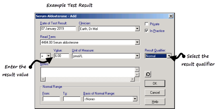 • Result Qualifier - Select as appropriate, for example Normal, High, Low. If anything other than Normal is selected, the result displays in red.