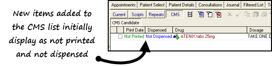 - The item is added to the CMS (Serial Prescribing) list with a status of Not Printed.