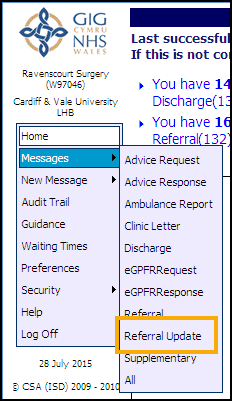 , select Summary - WCCG and log into the WCCG in the usual way.Remember - If you select a patient in Consultation Manager you are initially offered their details within WCCG, if you have no patient selected in Consultation Manager you can initially see messages for all patients within WCCG. - From the WCCG screen, select Messages - Referral Update.
