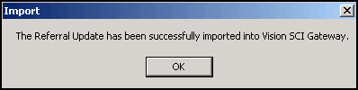 - The 'The Referral Update has been successfully imported into Vision SCI Gateway' message displays, select OK: