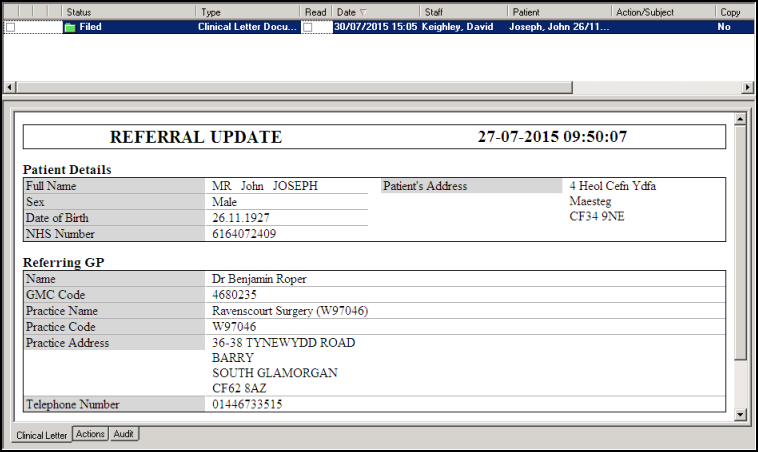 - The Referral Update displays in Consultation Manager having been received and filed via Mail Manager: