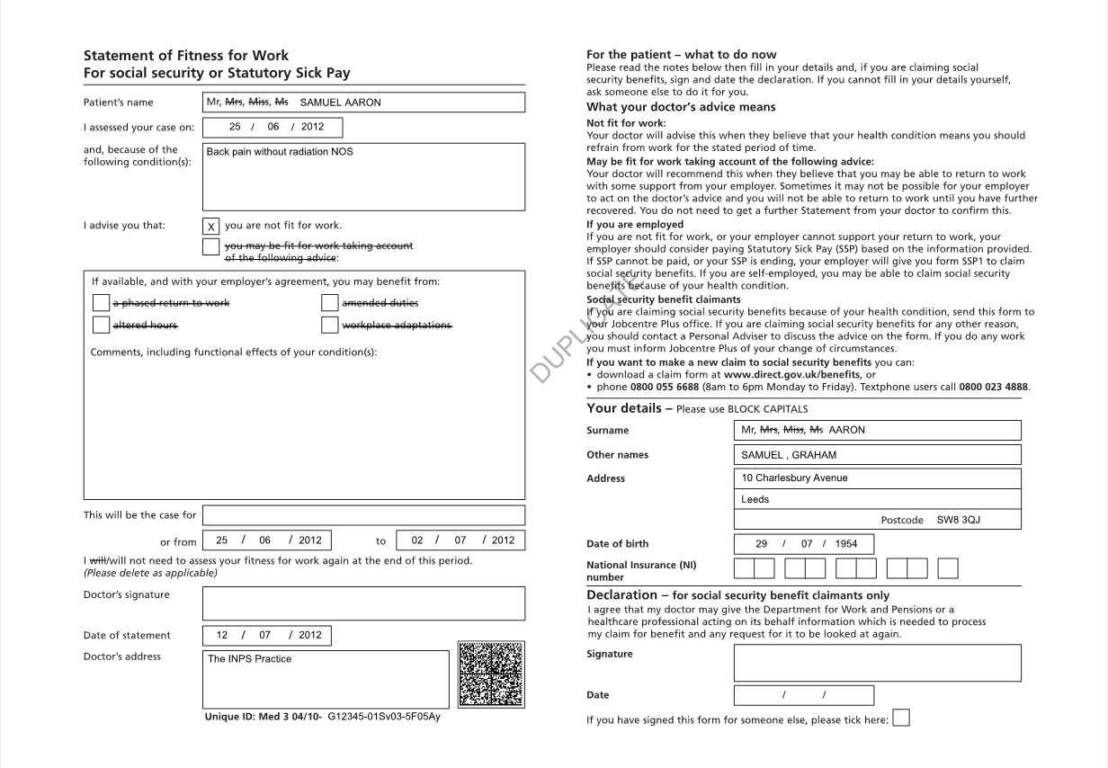 MED3 Doctor's Statement - Duplicate