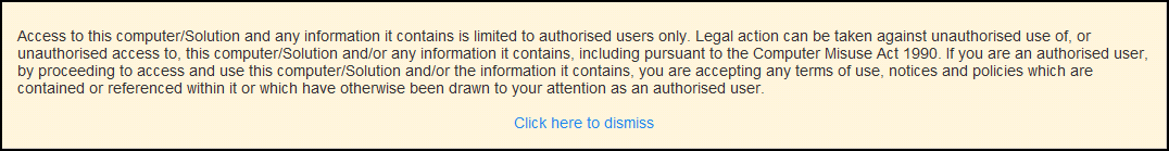 - Warning - In line with Information Governance guidance a warning reminding you of your responsibility and legal restraints displays on start up of Vision. The warning disappears after 10 seconds, or select Click to dismiss to clear manually: