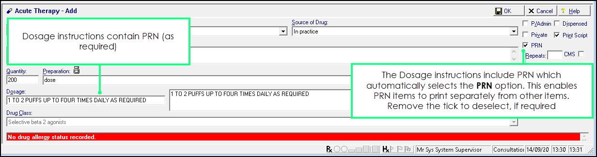 Adding a drug with an As Needed dosage instruction automatically selects a PRN option on Therapy Add, this can however, be deselected.