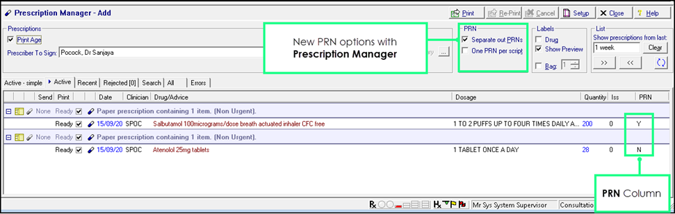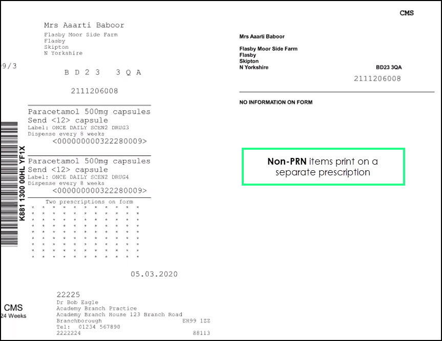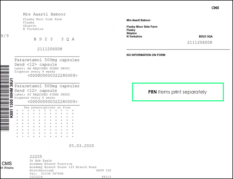 PRN Box – Remove the tick from the PRN box to print/send PRN drugs on the same prescription as non-PRN items