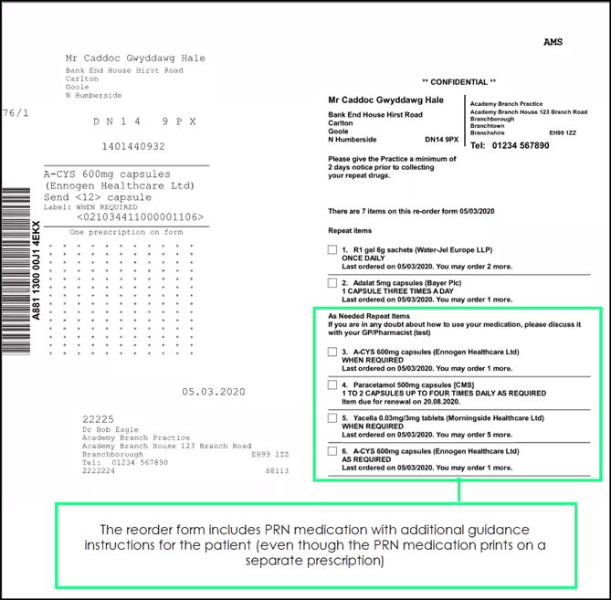 The reorder form prints on the right-hand side of a prescription and displays all repeat medication for a patient, including PRN items.