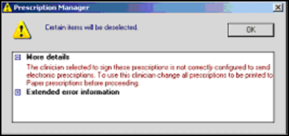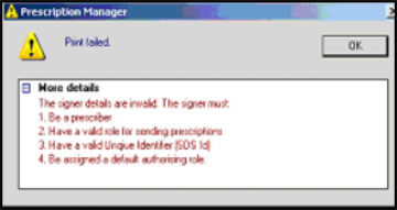- If the prescription is set to Dual and the Authorised Signatory/Assigned To clinician is the non-SSO GP, then when they select and try to print the item, they are told that it cannot be done: The signer details are invalid. The signer must (1) Be a prescriber (2) Have a valid role for sending prescriptions (3) Have a valid Unique Identifier (SOS Id) (4) Be assigned a default authorising role. Changing the prescription to Paper stops this.