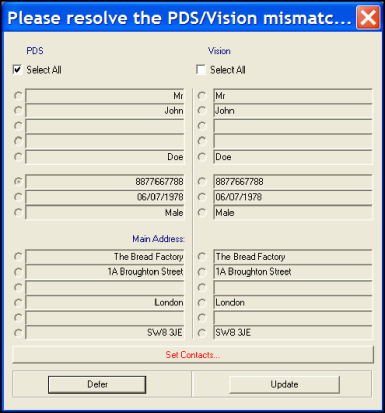 Synchronisation involves comparing the demographic details held nationally for the patient on the PDS with those on the local system. Any differences are highlighted to the end user by use of the "split-screen" mismatch dialog (see below).