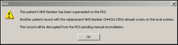 Select OK to continue. Any changes made do not update the PDS as the record is now decoupled. The situation has to be investigated locally as it indicates a duplicated NHS number. The record can be recoupled once the discrepancy has been resolved.