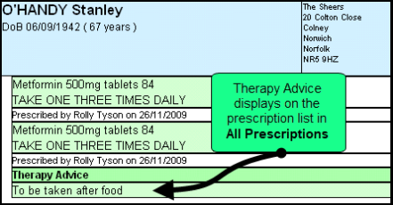 For the Authorised and Review Required tabs, any therapy advice added to the prescription displays in the prescription window. This prints on FP10 paper for the patient and is included in the electronic message.