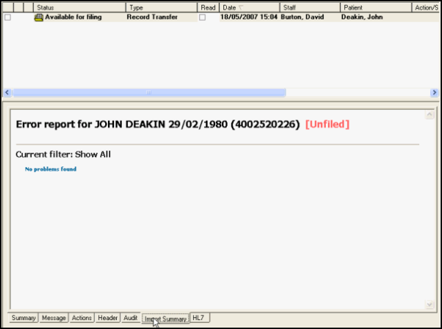 If there are any errors or degraded records, these are shown in red. These might include unfiled pathology, un-Read-coded medication, etc. Often allergies are a source of error as these do not file and need to be added later in Consultation Manager by a clinician see Degraded Records for details.