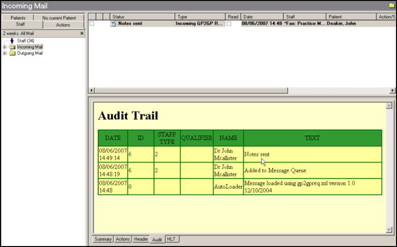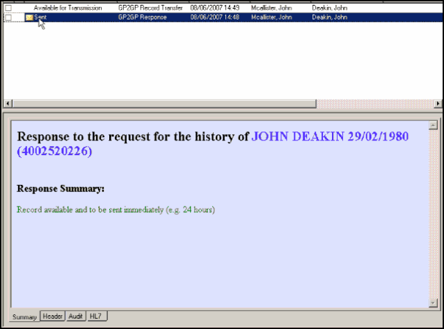 The audit trail on an outgoing message can be viewed, simply select the GP2GP Record Transfer with a status of Sent or Complete and then select the Audit tab.