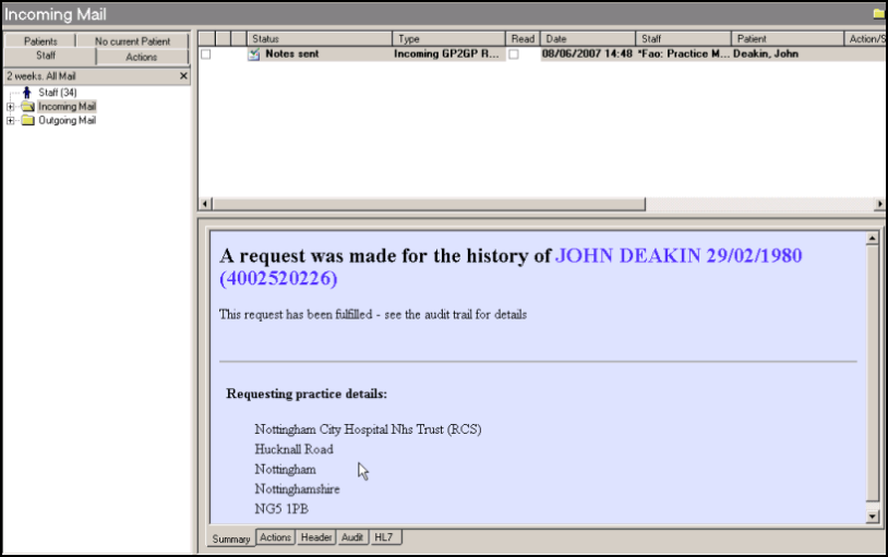 In Incoming mail, the Incoming GP2GP request status changes from Ready for Action to Notes Sent fairly quickly and the Summary tab states, "This request has been fulfilled - see the audit trail for details."