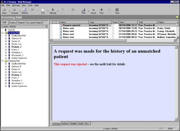 If a status of Transmission Error occurs (Outgoing Mail - GP2GP Record Transfer), the audit trail can be viewed for reasons for any transmission errors. These might occur: