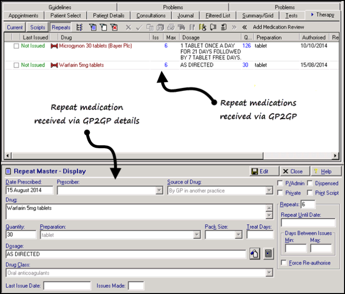 Repeat medication received via GP2GP has to be reauthorised before it can be issued, as the originating GP and source are not valid at your practice. For this reason, when viewed in Therapy - Repeats, imported repeat medication displays preceded with