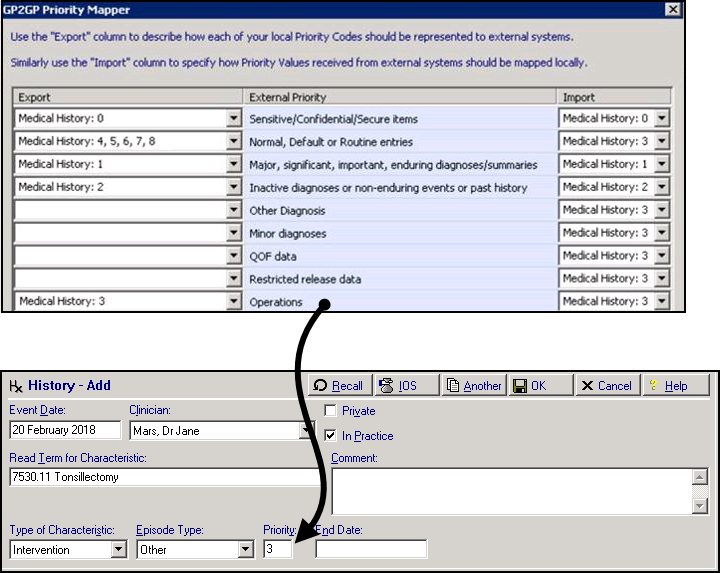 The receiving practice have their "Operations" External Priority to map to Import Priority 3. The Tonsillectomy medical history has priority 3 when received by Vision.