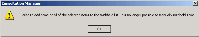 If you attempt to add data to the withheld data pane, you are prompted "Failed to add some or all of the selected items to the Withheld list. It is no longer possible to manually withhold items." Click OK to close.