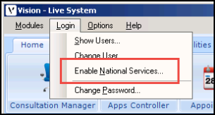 - From the Vision front screen, select Login – Enable National Services (if you have not entered your Smartcard you are prompted to do so).
