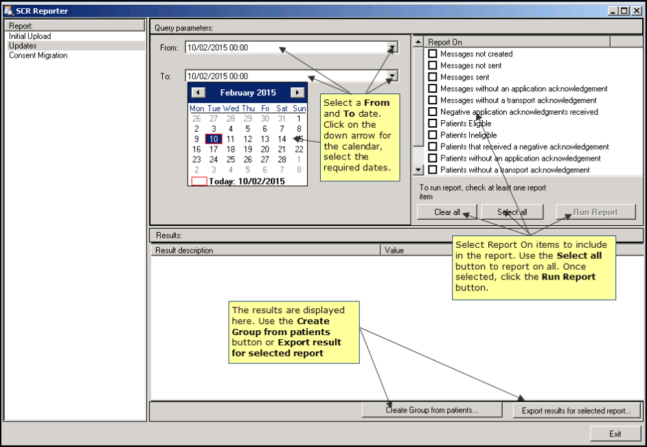 This report enables you to search for messaging success and failures for SCR updates sent from Consultation Manager or find ineligible patients found during a run of the Bulk Update, Bulk De-registration and Practice No Longer Contributing updates.