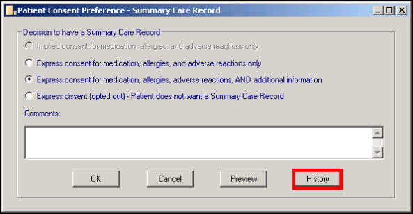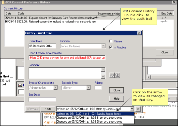 - If the consent is changed numerous times on the same day, only one entry is displayed. To view all of the changes for that day, double click on the entry, the History - Audit Trail is displayed, click the arrow at the bottom of the entry to view the audit trail which shows all changes made that day.