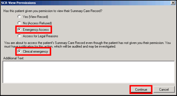 - Select Emergency Access, you are prompted "You are about to access the patient's Summary Care Record even though the patient has not given you their permission. You must have justification for this action, which will be audited and may be investigated." Select Clinical Emergency.