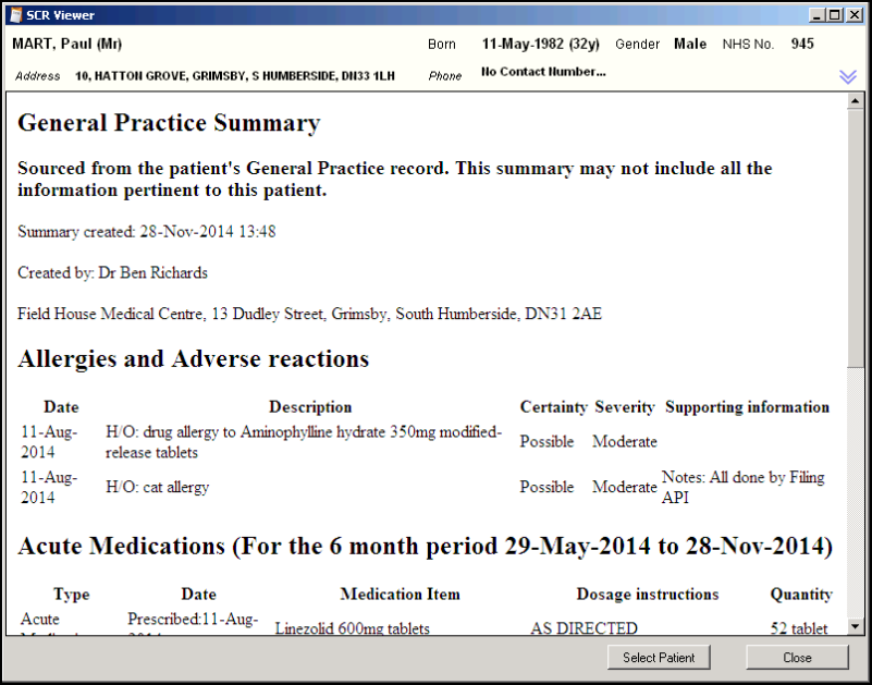 - Go to Vision - SCR - SCR Viewer. The SCR Viewer window with the Select Patient box open is displayed, select the non-permanent patient, eg Surname.