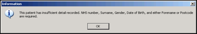 If the patient doesn't have the mandatory registration details, when selecting the patient in the SCR Viewer you are prompted: "This patient has insufficient detail recorded. NHS number, Surname, Gender, Date of Birth, and either Forename or Postcode are required." Click OK to close. The SCR message cannot be viewed.