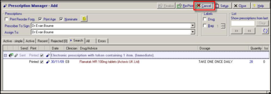 When the Prescription Manager screen is displayed, select Cancel. The following message appears: Would you like to delete the following local item as well? Delete/Leave/Cancel. Press Delete.
