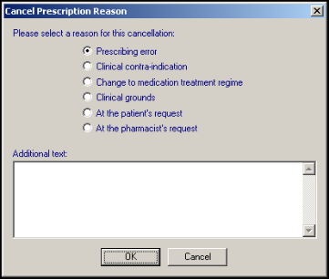After you have confirmed you wish to cancel an item/prescription, you must select a reason for cancellation: