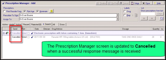 If a successful cancellation is received, the Prescription Manager screen shows that the prescription has been Cancelled.