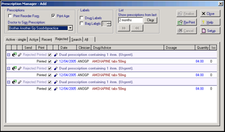 The Rejected tab on Prescription Manager lists all recently rejected messages, and rejected messages are also listed on the Recent tab. The Send status is Rejected and the Print Status printed. If a medication is entered with a blank Dosage field, the message is rejected by the EPS process.