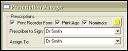 - Assign To - This applies to electronic prescriptions and denotes the intended member of staff who is next in line to process the prescriptions. This defaults to the same as the signer, though it is possible to assign the patient’s prescriptions to another member of staff if required. The selection is stored against the prescription record and used by the bulk prescribing view to produce the list of prescriptions to process.