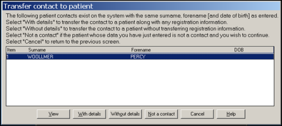 After finding a patient on the PDS system, Vision checks to see if the patient has been previously added to the Vision system as a patient. Vision also checks if the patient has been recorded as a contact and give you the option of transferring their information to the Registration screen. You have the following options: