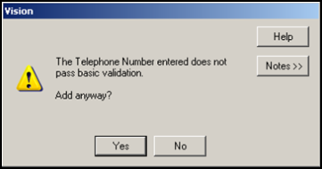 If you do not enter communication details in the correct format the following message is displayed "The telephone number entered does not pass basic validation. Add anyway?"