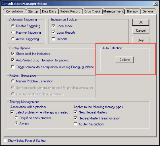 - From Consultation Manager - Consultation - Options - Setup - Management tab, select the Options button under Auto Selection.