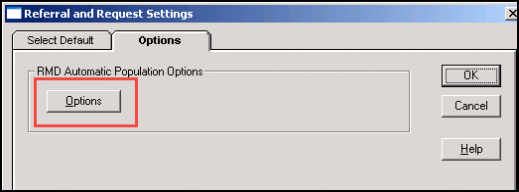 - From Consultation Manager - List - Default Referrals/Requests, click on the Options tab, then under RMD Automatic Population Options, select the Options button.