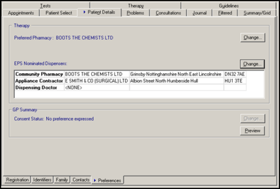 or tab. - From the bottom row of tabs, select Preferences. Under the EPS Nominated Dispensers section, any dispensers previously nominated by the patient are listed (the type of contractor, name and address are displayed).