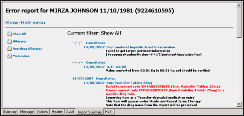 If there are any errors or degraded records, these are shown in red. These might include unfiled pathology, un-Read-coded medication, etc. Often allergies are a source of error as these do not file and need to be added later in Consultation Manager by a clinician see Degraded Records for details.