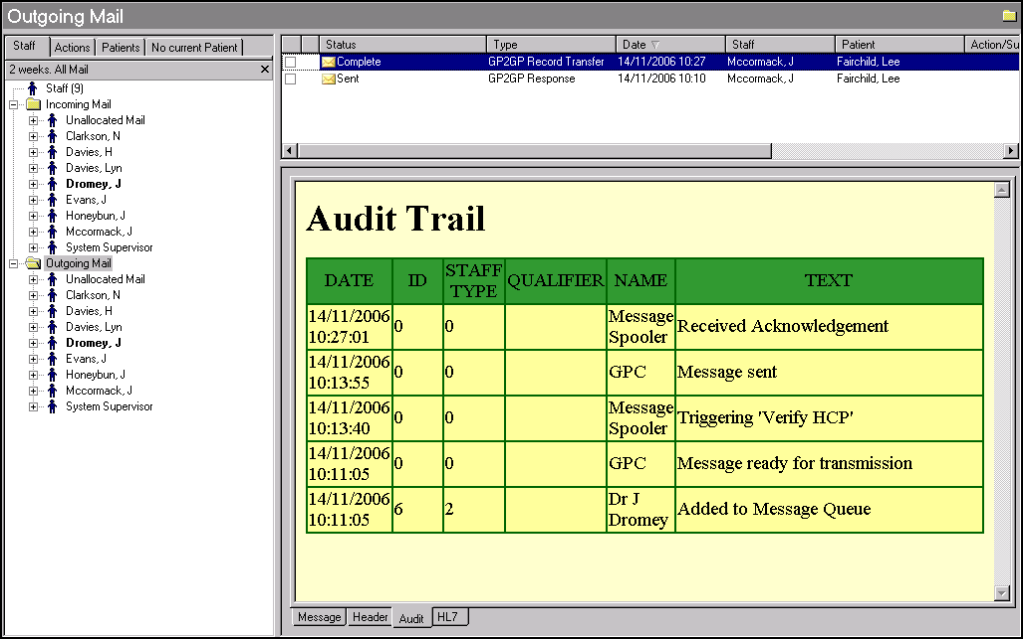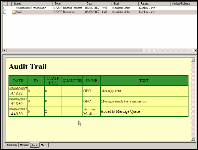 The audit trail on an outgoing message can be viewed, simply select the GP2GP Record Transfer with a status of Sent or Complete and then select the Audit tab.