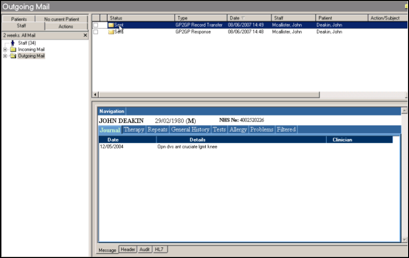 In Outgoing Mail, the GP2GP Record Transfer shows as Sent and the content of the outgoing record can be seen on the Message tab.