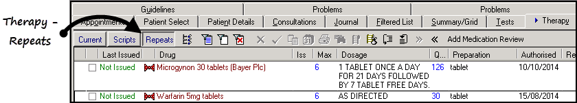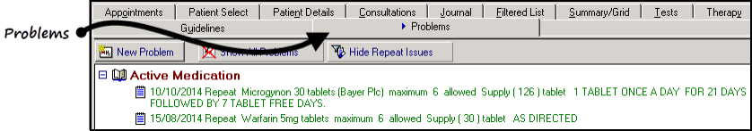 Consultation Manager, select the patient required and open a consultation if necessary. - Select either Therapy - Repeats or Problems - Active Medication.