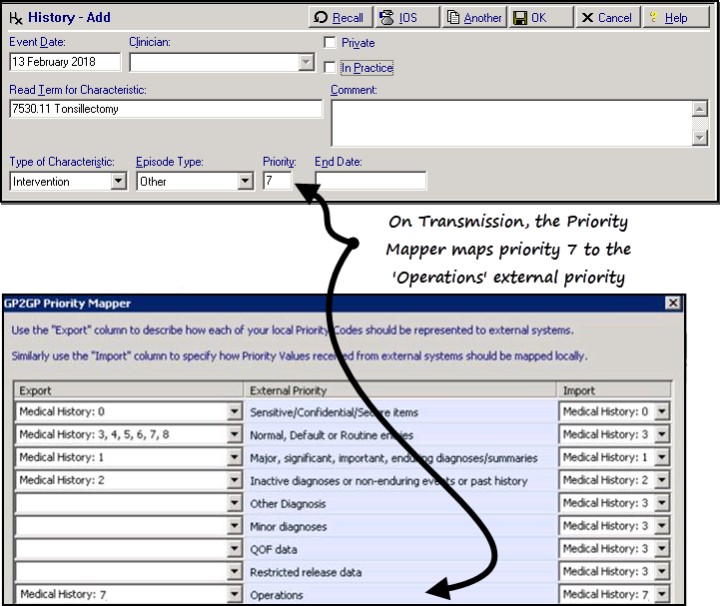 In the example below, the exporting practice have set their Export Priority 7 to map to the "Operations" External Priority. This means that medical history with a priority 7 is defined as an operation.