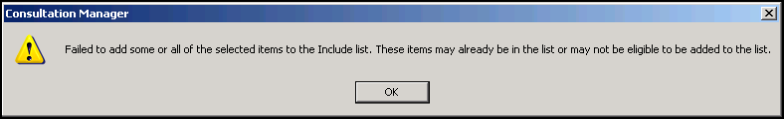 If you try to add data to the National Summary that is not permitted, you will be prompted with the following message: "Failed to add some or all of the selected items to the Include list. These items may already be in the list or may not be eligible to be added to the list." Click OK to close.