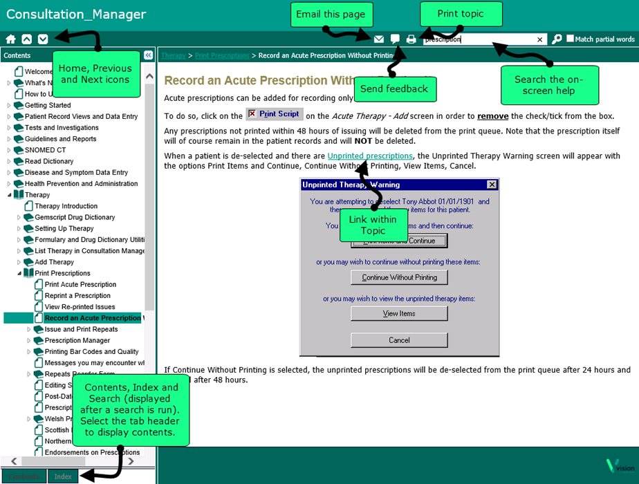 - Home - Opens the Help home page. In the example shown above selecting the Home icon opens the Consultation Manager on-screen help home page. -