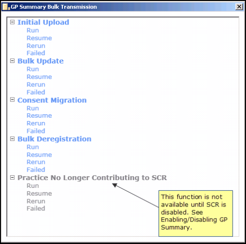 - Practice No Longer Contributing to SCR - This new function enables you to send an update summary an additional text when the SCR function is disabled/switched off, for example when a practice closes. This upload is inactive until the SCR function is switched off, the upload then activates and can be run. See Enabling/Disabling GP Summary