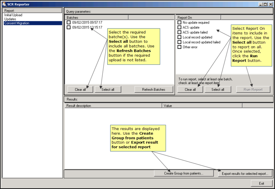 - Creates a patient group in Vision. See Create a Patient Group - Export results for selected report