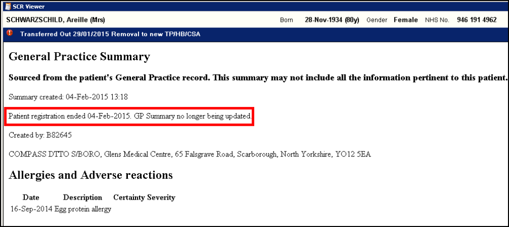 When a Deduction transaction is received from your TP and processed the patients registration status is changed to "Transferred Out". This triggers an automatic process which checks if the patient has a GP Summary from the practice on the Spine. If they have, a SCR will be sent updating the summary to show that the patient is no longer registered with your practice, and the following message is added: "Patient registration ended (date of deduction is displayed). GP Summary no longer being updated." If the latest GP Summary on the Spine has a different practice code (NACS code) no update is sent.