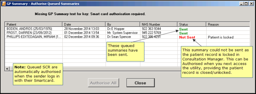 Note - Summaries queued when a Clinician has not logged in with a Smartcard will be automatically sent from the queue when the Clinician next logs in, unless they have already been manually authorised.